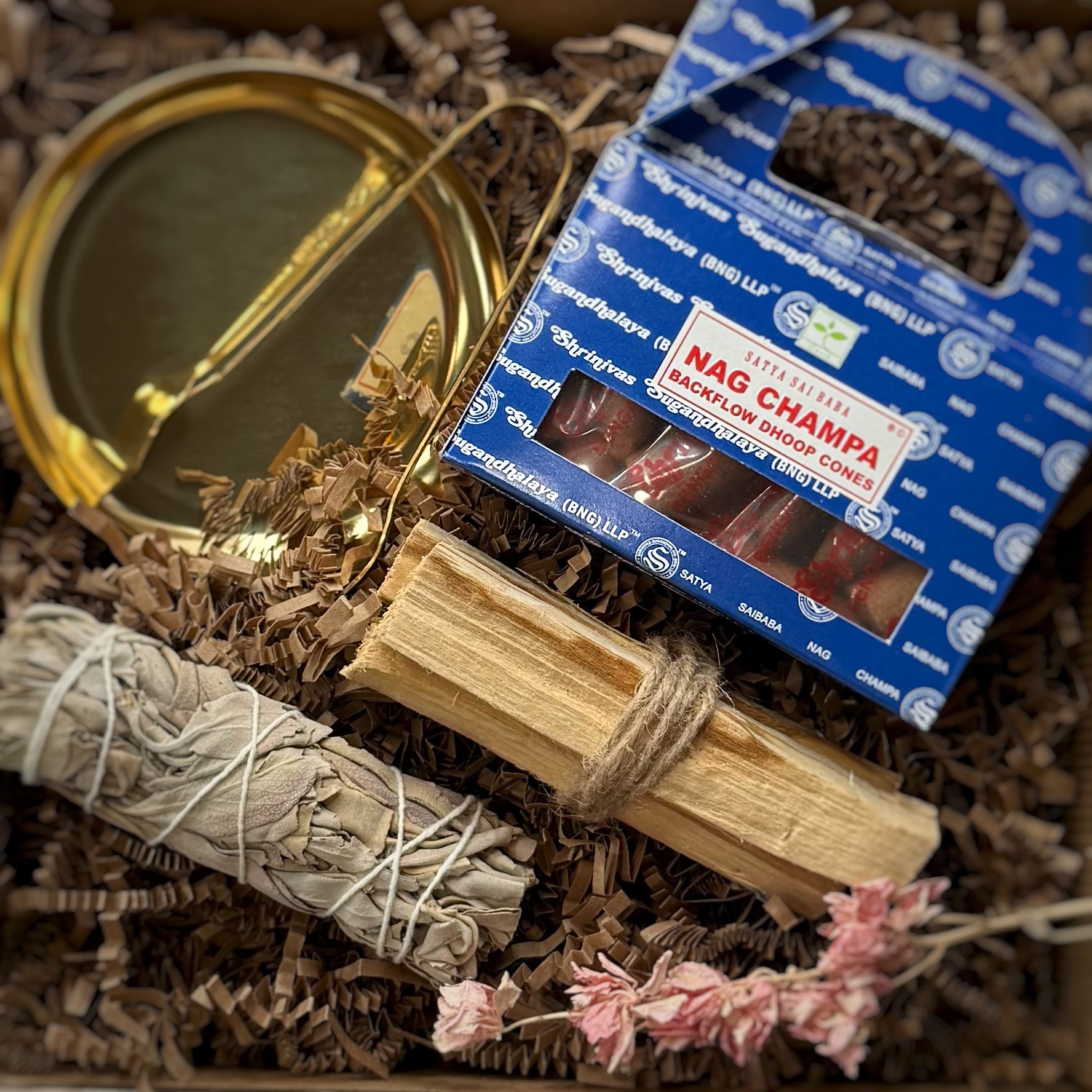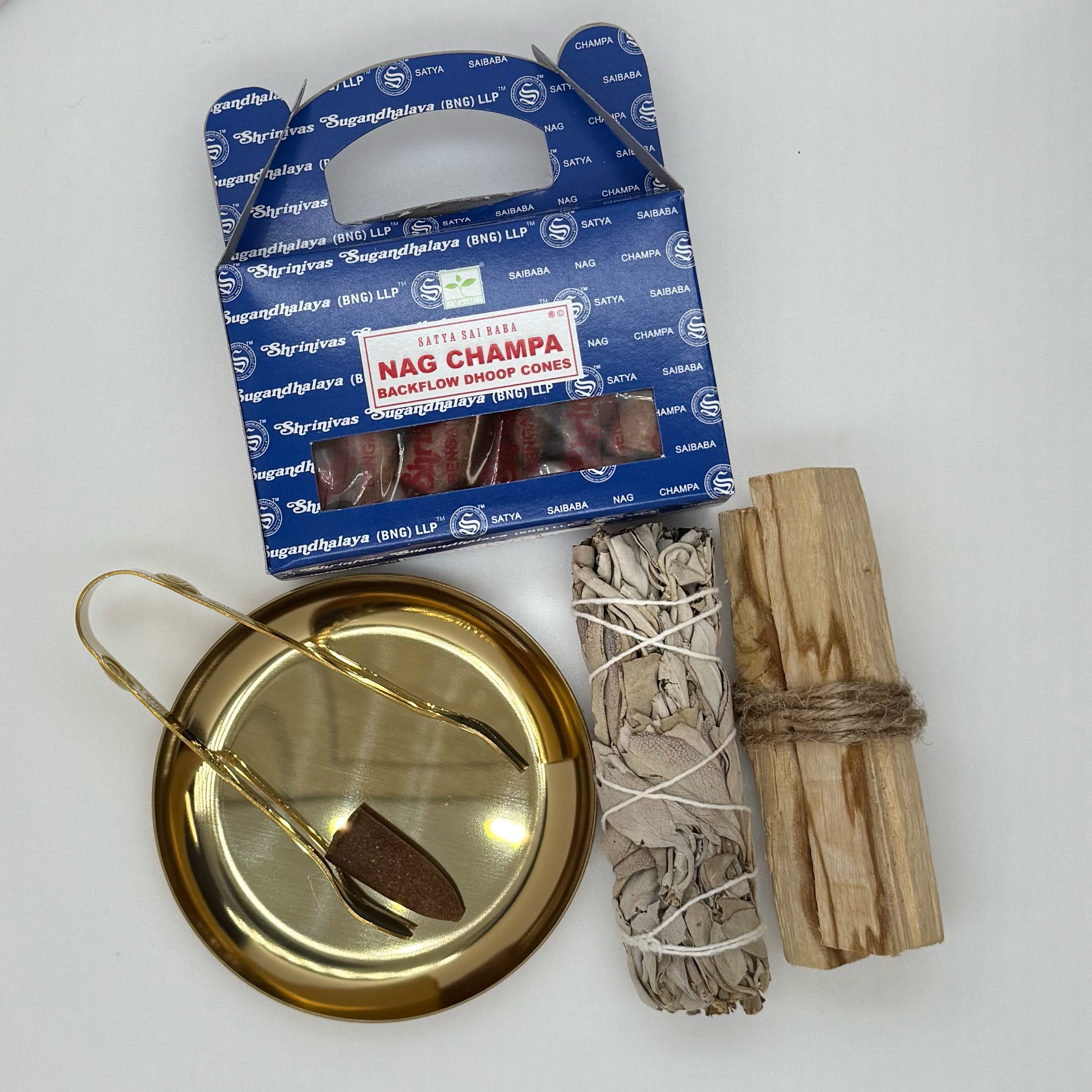 Zestaw ENERGIA ŻYCIA- indyjskie kadzidła stożkowe Nag Champa. Palo santo. Biała szałwia. Złota metalowa podstawka. Szczypce do kadzideł.