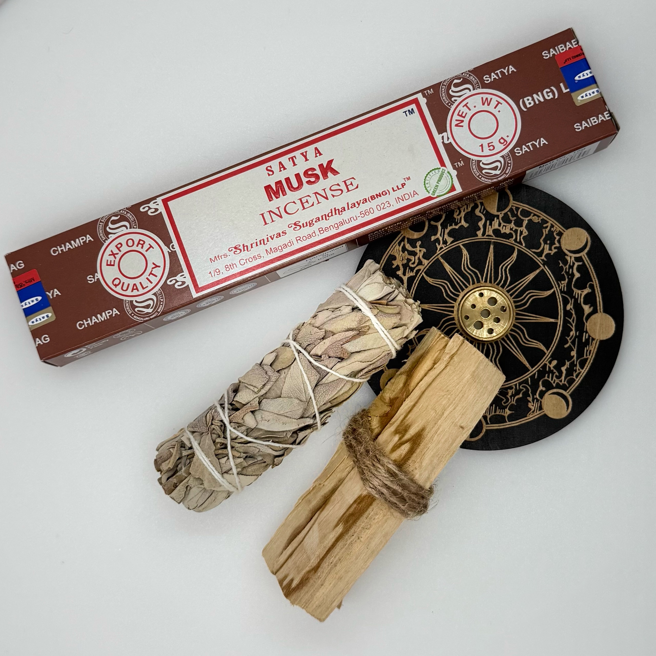 Zestaw MIŁOŚĆ I ŚWIATŁO – kadzidła indyjskie Satya. Palo santo. Biała szałwia. Drewniana podstawka pod kadzidła stożkowe i patyczkowe.