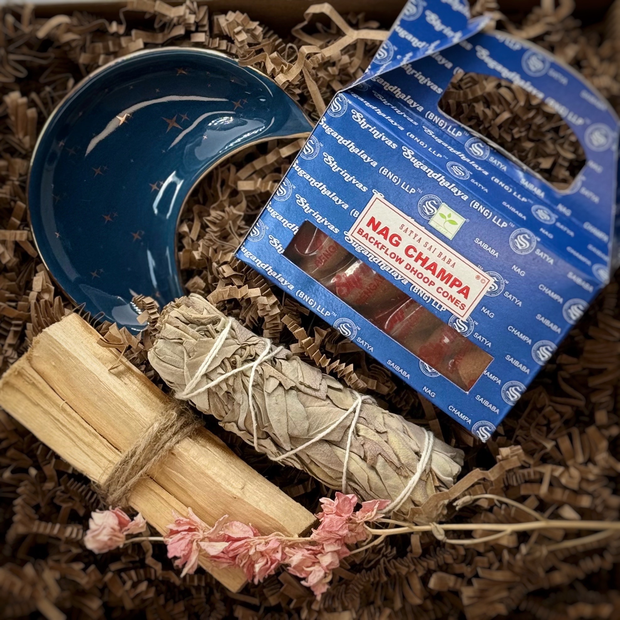 Zestaw MISTYCZNA PODRÓŻ – indyjskie kadzidła stożkowe Nag Champa. Palo santo. Biała szałwia. Ceramiczna podstawka w kształcie księżyca.